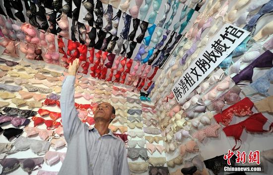 [國內新聞]4月21日,海南省三亞市崖城鎮(zhèn)的陳清祖花費20年時間收集5000余件文胸,在一間棟不起眼小房間的墻壁上、天花板上掛滿了各式各樣的女性文胸,數量多達5000余件,而這些令人目不暇接的“藏品”來自全國30多所高校的女生。據陳清祖介紹,他的夢想是將來打造一間文胸收藏館,通過展示內衣,提高全社會對女性乳房健康的關注度。圖為陳清祖展示他的“特別藏品”。